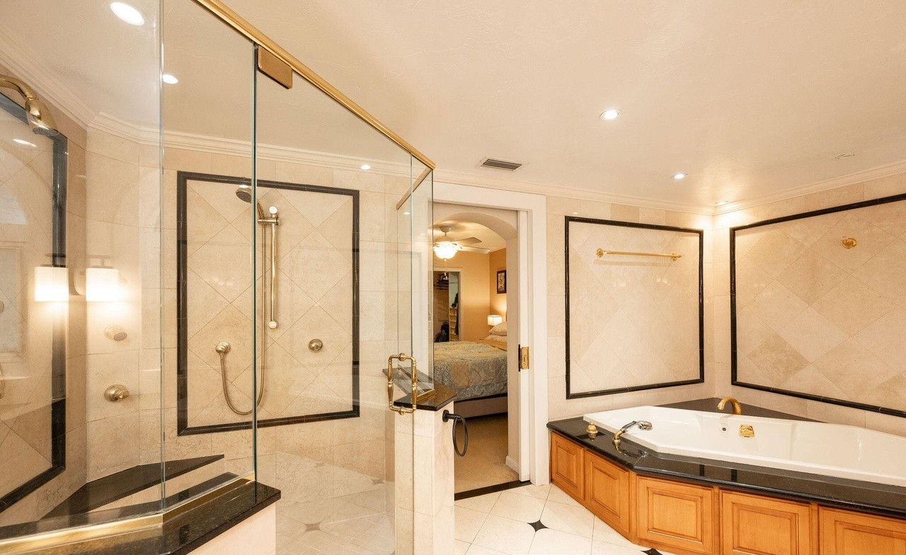 A stunning primary bathroom suite featuring a spa-like design with a frameless walk-in shower and freestanding soaking tub, both adorned with cream and beige marble tile and accented by warm brass hardware. The light wood vanity with marble countertop and classic millwork details create a sophisticated blend of traditional elegance and contemporary luxury, enhanced by recessed lighting and high ceilings that amplify the sense of openness and serenity.