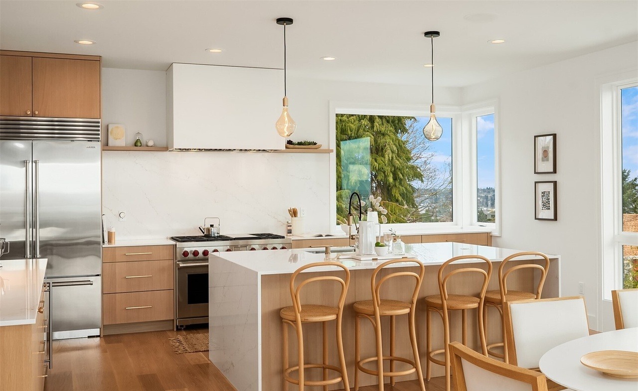 A bright, serene kitchen featuring a stunning two-tone design with light wood and white cabinetry, quartz waterfall island, and abundant natural light from expansive windows overlooking verdant landscape. The space masterfully blends organic warmth with contemporary refinement through natural materials, thoughtful pendant lighting, and clean modern proportions—creating an inviting yet sophisticated cooking environment.