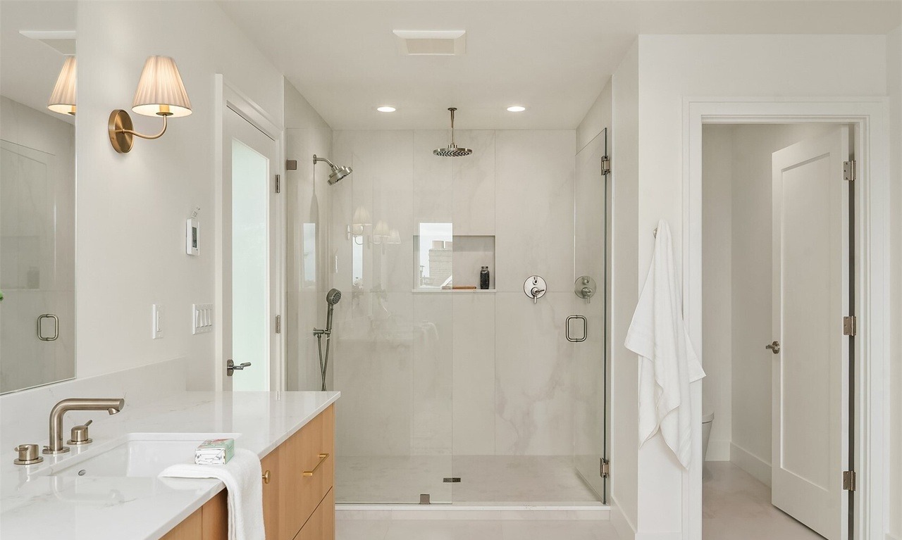 Floating VanityWalk In ShowerDouble VanityFrameless Glass Shower EnclosureDouble Shower HeadsRecessed LightingStatement LightingCrown MoldingLarge Format TileCustom Millwork