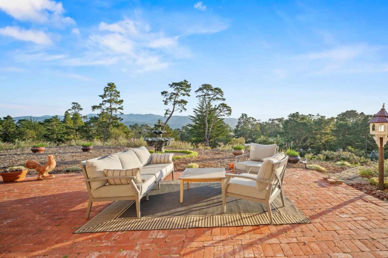 A stunning hilltop patio retreat with terra cotta brick flooring and curated outdoor furniture offering panoramic views of rolling mountains and forested landscapes. The space exemplifies desert modern luxury with warm earth tones, natural materials, and thoughtfully arranged lounge seating that balances sophisticated comfort with organic design principles.