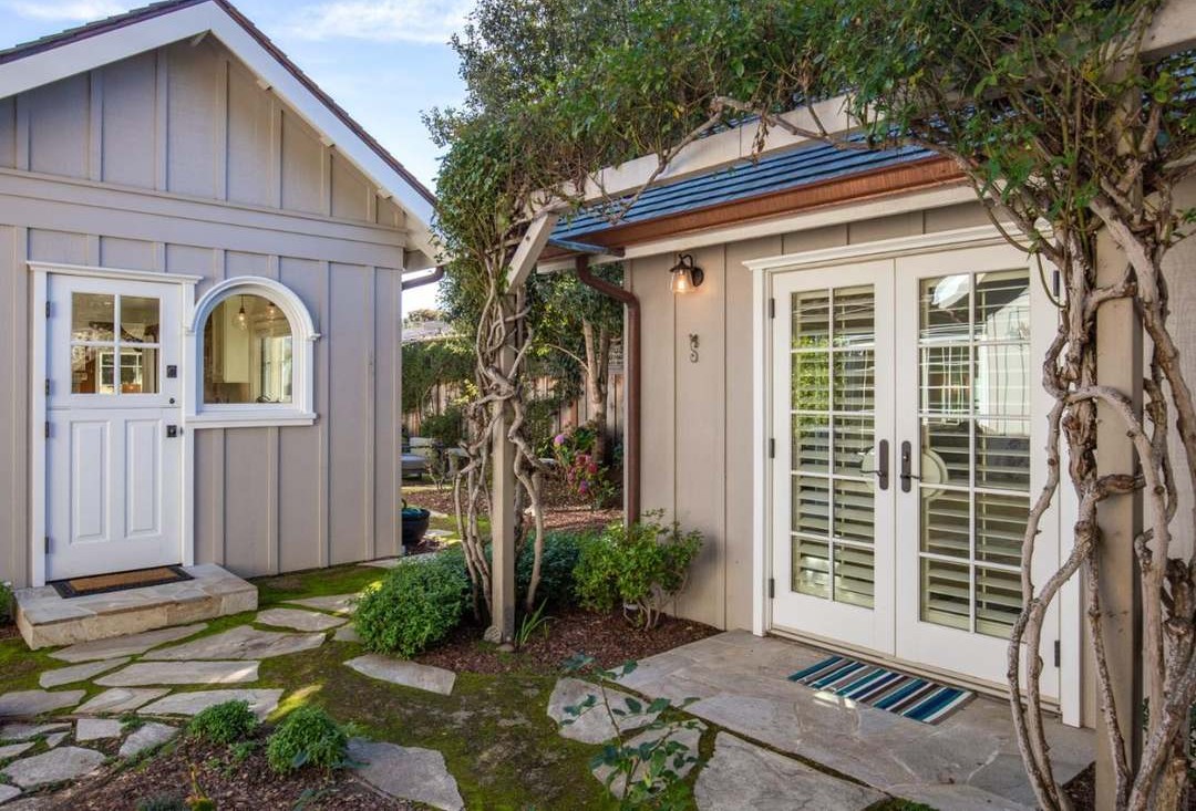 A beautifully composed coastal-modern patio featuring mature gnarled trees, white shuttered French doors, and a wood-trimmed pergola with blue metal detailing. The space exemplifies contemporary outdoor living with its neutral palette, natural materials, and seamless indoor-outdoor flow through multiple access points.