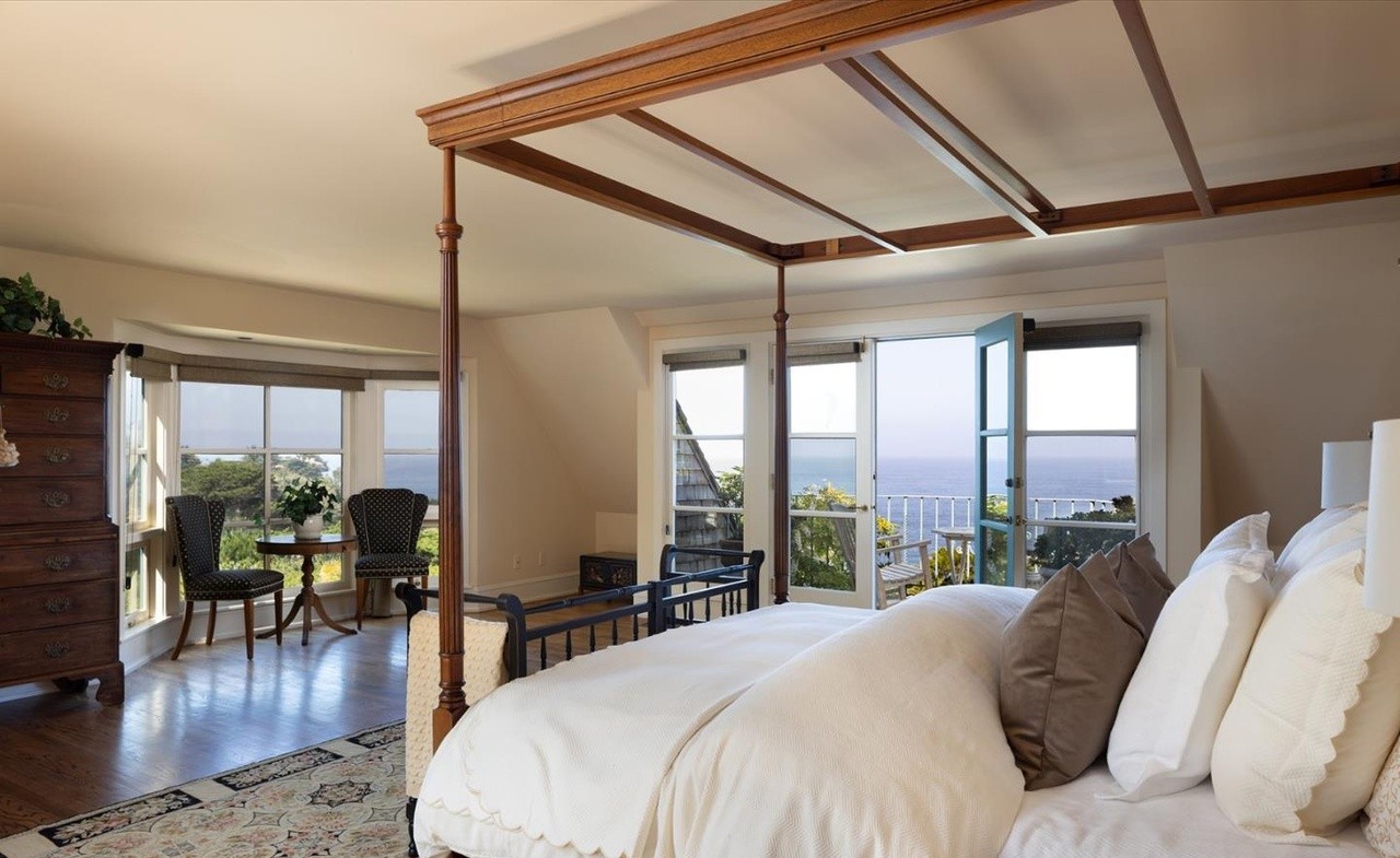 A stunning primary bedroom with spectacular ocean views framed by floor-to-ceiling windows, featuring a four-poster canopy bed with crisp white linens and a coffered wood ceiling with exposed beams. The space seamlessly blends coastal elegance with transitional design through warm neutral tones, quality hardwood flooring, and custom architectural details that create an exceptionally serene and sophisticated retreat.