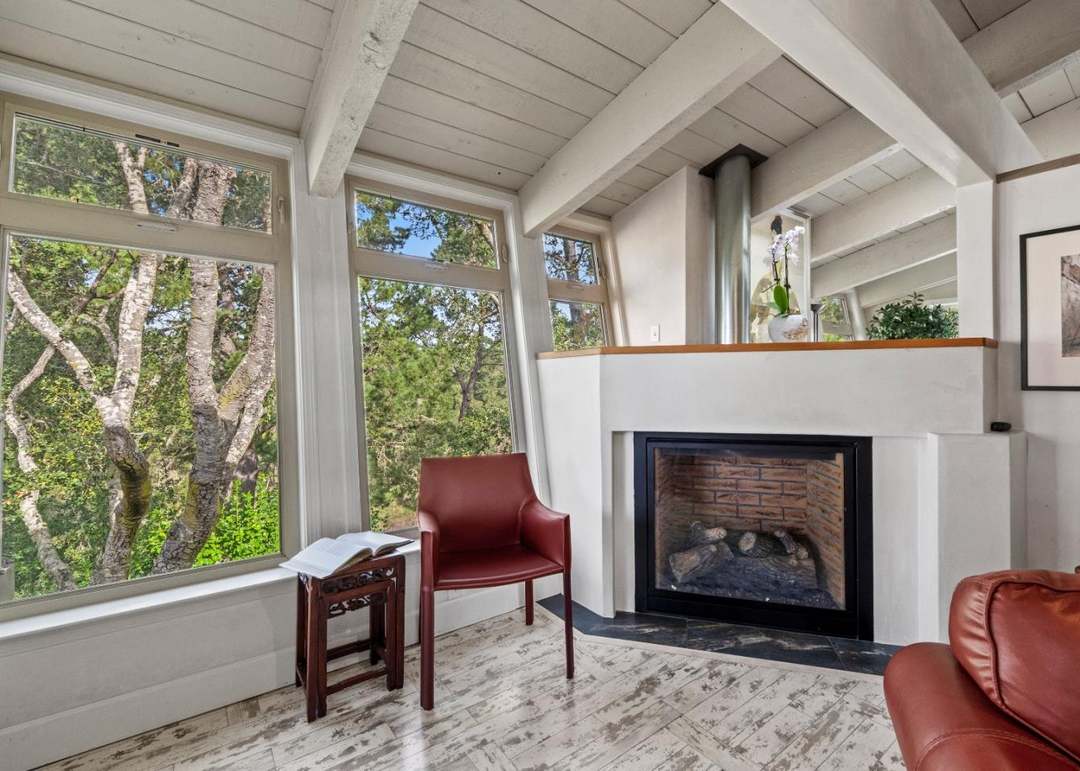 A serene, light-filled living room seamlessly blends transitional and organic modern design through its marriage of soaring white-painted walls with natural wood exposed beams, oversized windows framing mature forest views, and a sculptural white fireplace grounded by charcoal stone. The warm leather seating in rust tones and stone flooring create an inviting, sophisticated retreat that feels both contemporary and timelessly elegant.
