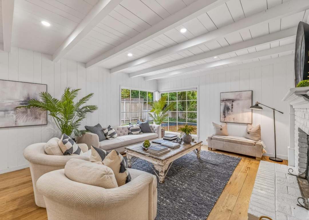 A sophisticated great room that exemplifies modern transitional design, featuring crisp white shiplap walls, exposed ceiling beams, and expansive floor-to-ceiling windows flooding the space with natural light. The neutral palette of cream, beige, and gray upholstery pairs elegantly with hardwood flooring and a statement fireplace, creating a serene yet luxurious retreat that balances contemporary comfort with timeless architectural detail.
