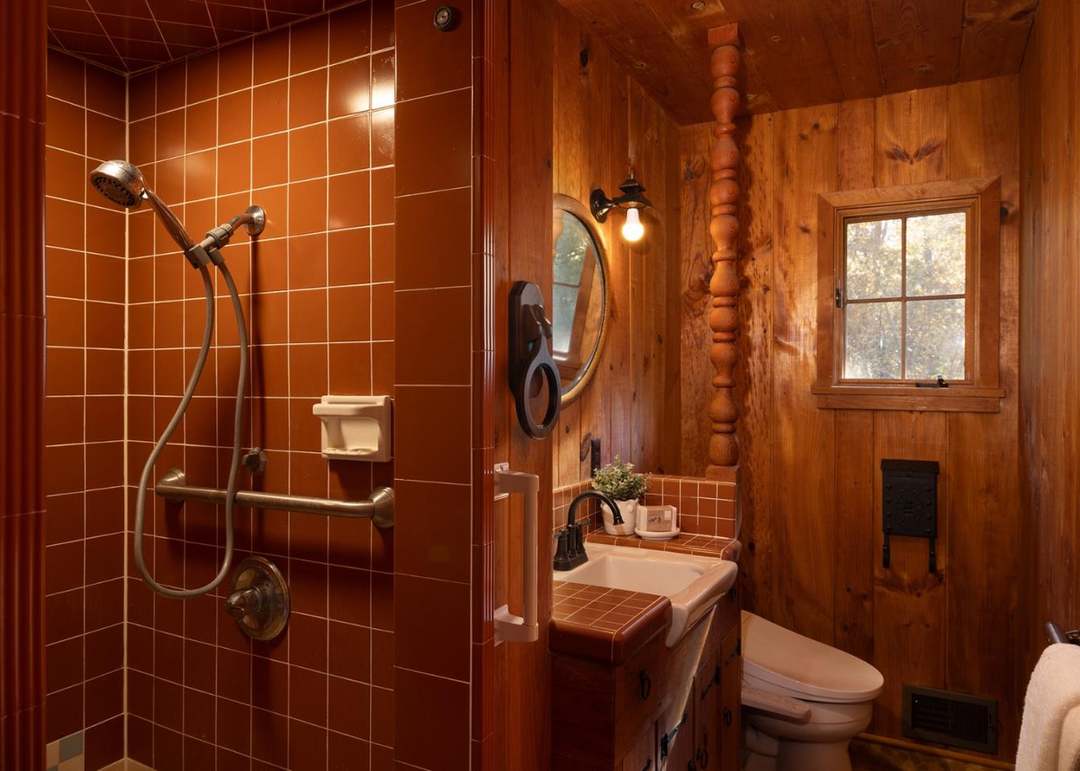 A rustic mountain bathroom featuring rich warm wood paneling and terracotta ceramic tilework that creates an inviting, cabin-like atmosphere. The thoughtful design pairs natural wood construction with modern fixtures and lighting, creating a luxurious retreat with authentic mountain character.