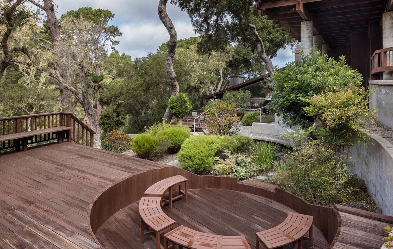 A sophisticated multi-level outdoor patio seamlessly integrated with mature native landscaping and organic wood furnishings, featuring a sculptural curved seating arrangement that celebrates the connection between architecture and nature. The design exemplifies high-end outdoor living with its thoughtful material palette, environmental consciousness, and focus on creating intimate gathering spaces within a verdant landscape.