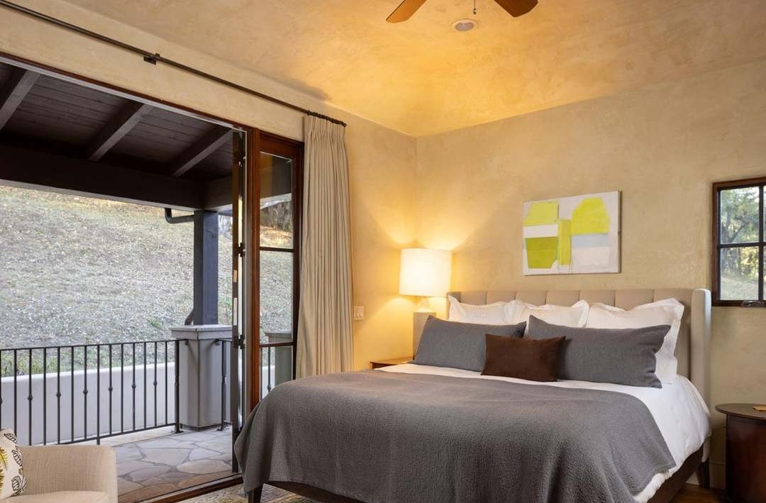 A serene primary bedroom featuring warm venetian plaster walls, abundant natural light from floor-to-ceiling glazed doors opening to a private balcony, and soft neutral tones anchored by a substantial upholstered headboard. The space balances contemporary comfort with organic materials and warm ambient lighting, creating an intimate sanctuary with mountain views.