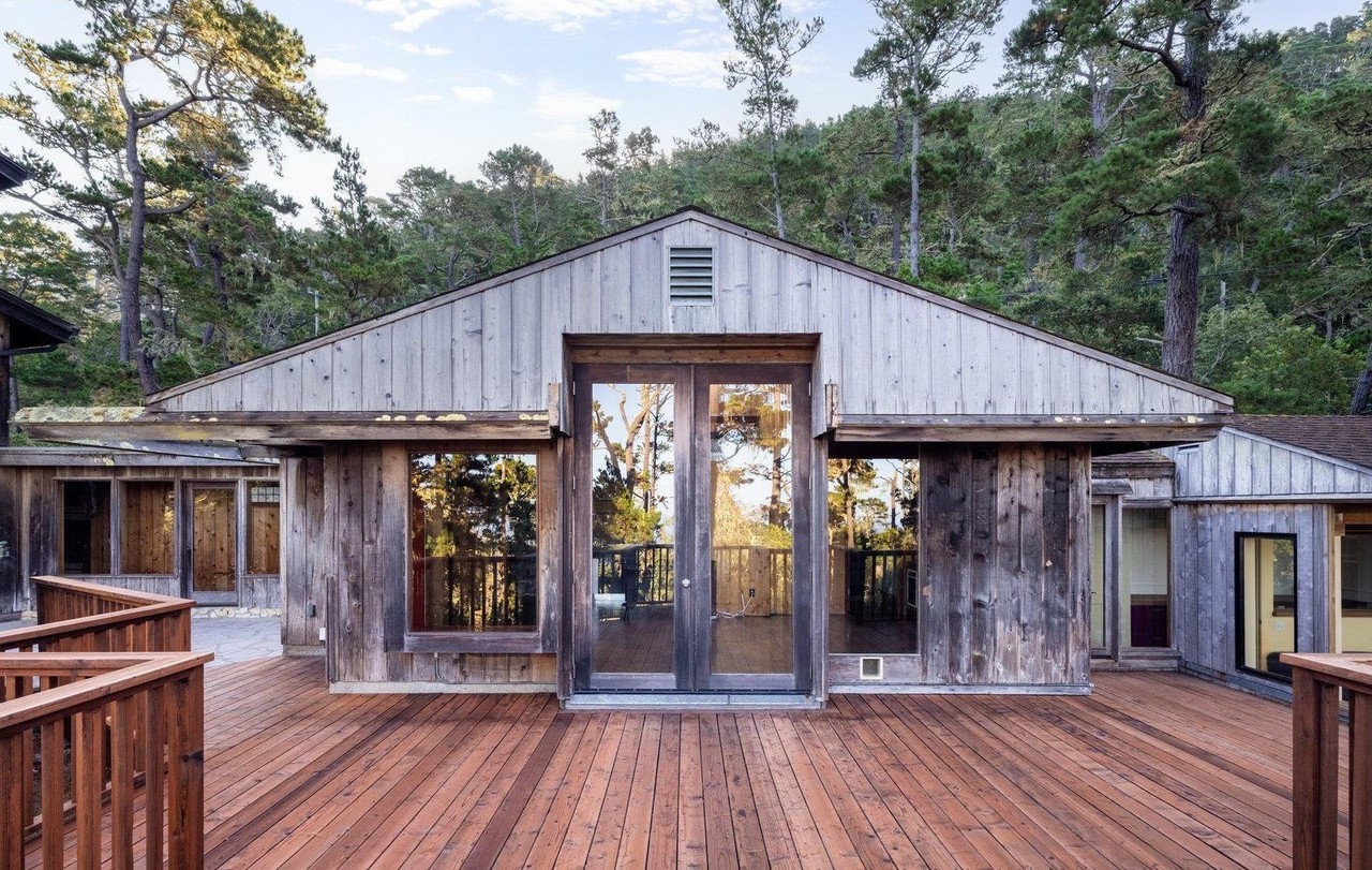 This sophisticated mountain modern patio seamlessly blends weathered wood siding with floor-to-ceiling windows and a striking vaulted gable ceiling, creating an airy yet intimate outdoor living space that merges contemporary design with rustic charm. The expansive wooden deck and warm material palette exemplify high-end outdoor architecture designed for year-round enjoyment amid towering forest surroundings.