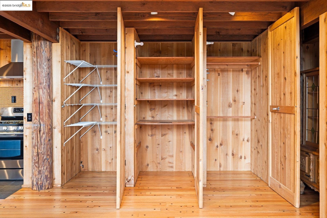 Built In ShelvingCustom MillworkExposed BeamsWire ShelvingBarn Style DoorsHigh Ceilings