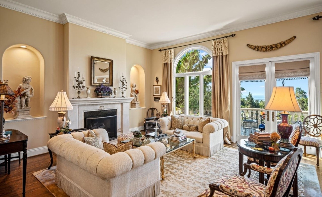 A formally appointed living room showcasing classical architecture with elegant transitional furnishings, featuring cream-toned upholstery, ornamental moldings, a prominent fireplace, and abundant natural light streaming through arched windows and French doors. The sophisticated palette of warm neutrals with brass and gold accents creates a refined, luxurious atmosphere.