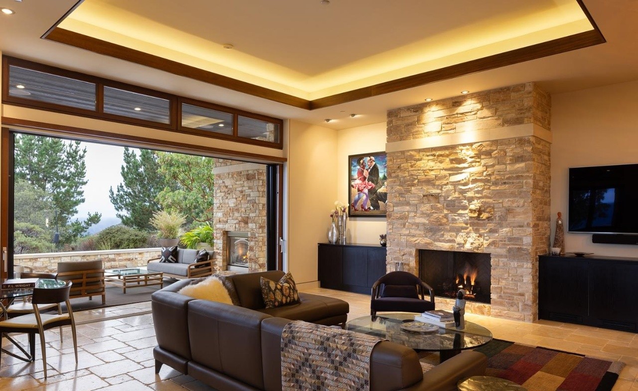A stunning contemporary great room featuring a dramatic stacked-stone fireplace wall and warm coffered ceiling with integrated lighting that creates an inviting, sophisticated atmosphere. The space seamlessly blends indoor and outdoor living through expansive floor-to-ceiling glass doors, complemented by rich leather furnishings, dark built-in cabinetry, and organic materials that define high-end desert modern luxury.