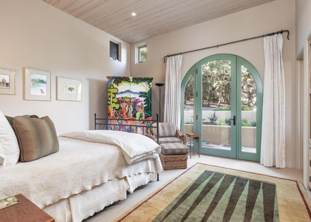 A serene primary bedroom suite featuring striking sage-green arched double doors that frame views of the outdoor landscape, paired with a warm wood-plank ceiling and creamy neutral walls. The space masterfully blends organic modern warmth with transitional architectural details, creating an airy, sophisticated retreat bathed in abundant natural light.