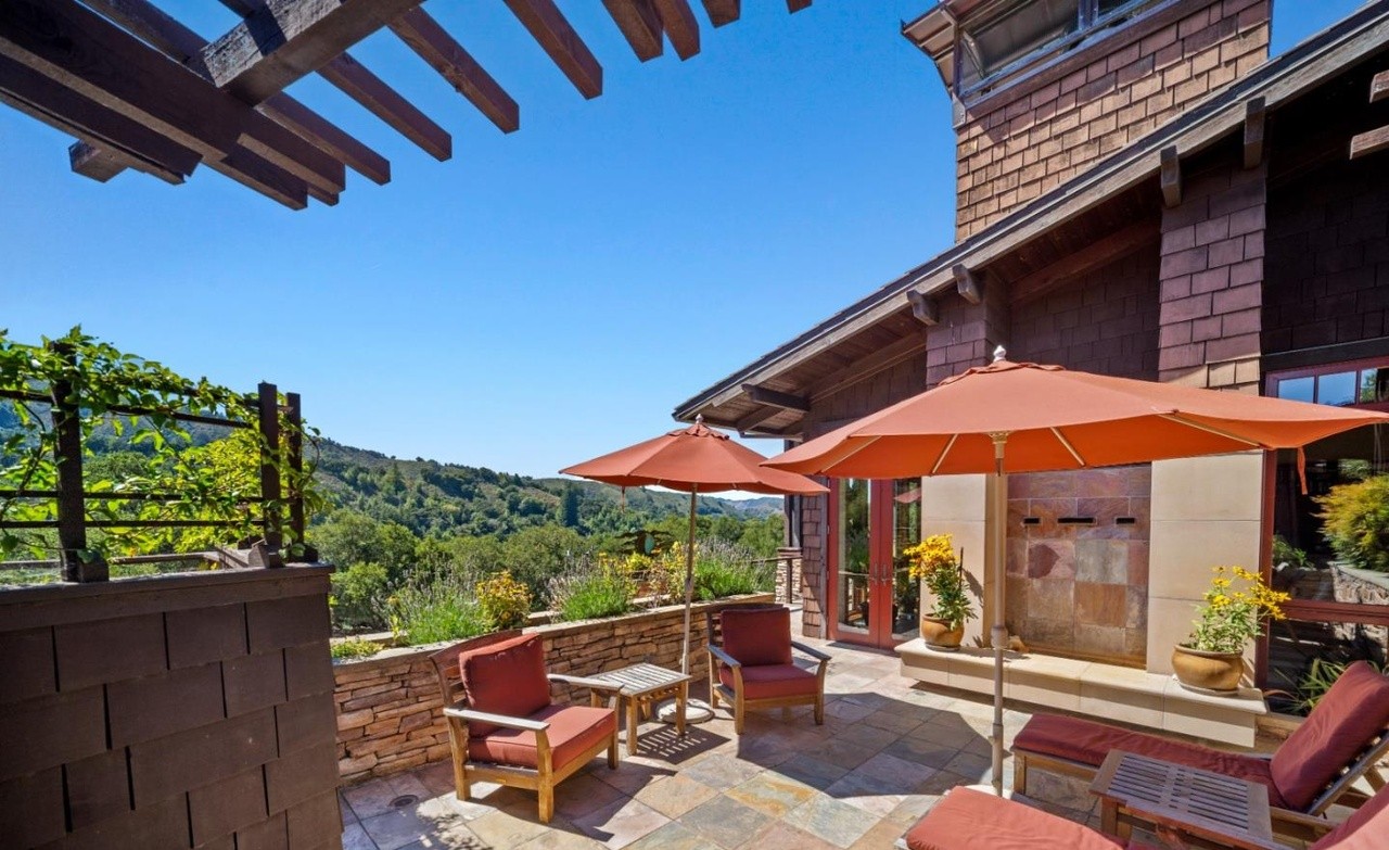 A stunning hilltop patio seamlessly blending Mediterranean warmth with organic modern design, featuring weathered brick architecture, wooden pergola structures, and stone flooring overlooking expansive forested valleys. The space is furnished with teak seating and oversized terracotta umbrellas, creating an elegant yet relaxed outdoor living environment with abundant natural light and mountain vistas.
