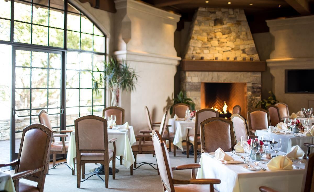 An elegant formal dining room bathed in natural light from floor-to-ceiling windows, anchored by a dramatic stacked-stone fireplace with warm ambient lighting. The space seamlessly blends transitional and organic modern aesthetics through its sophisticated combination of exposed wooden beams, high ceilings, neutral linen-upholstered dining chairs, and carefully curated table settings.
