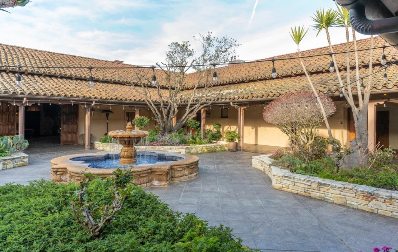 An exceptionally refined Mediterranean/Spanish Colonial courtyard featuring a stunning blue-tiled central fountain, terra-cotta barrel-tile roofing, and cream-colored plastered walls surrounding an expansive stone-paved patio. The design exemplifies old-world elegance with sophisticated restraint, combining architectural elements like arched colonnades and ornamental lanterns with mature palms and curated plantings to create a serene, resort-like outdoor living sanctuary.