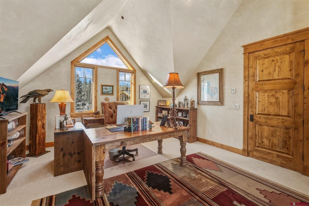 A sophisticated mountain retreat home office features soaring vaulted ceilings with abundant natural light from an architectural skylight window, warm honey-toned wood furniture paired with cream walls and a quality woven area rug. The space masterfully blends transitional elegance with mountain modern sensibility, creating an inspiring yet serene workspace with custom millwork and carefully curated design details.
