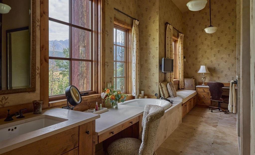 Double VanityFloor To Ceiling WindowsMountain ViewsCustom MillworkPendant LightingCrown MoldingHigh CeilingsNatural LightFurniture Style Vanity