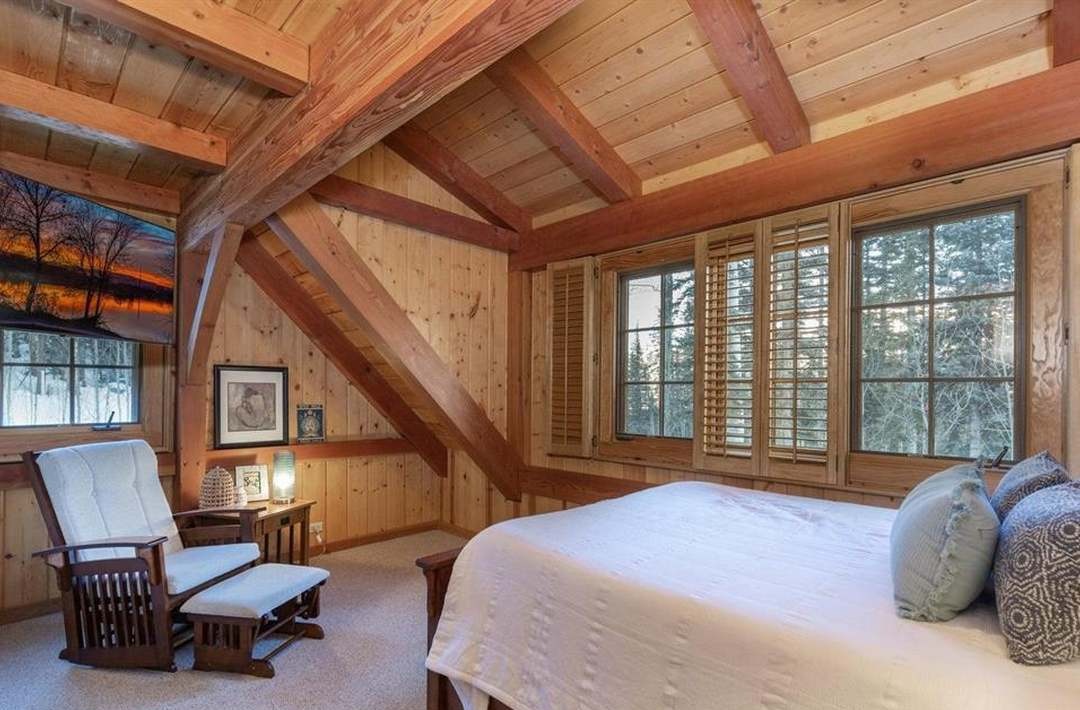 A stunning lofted primary bedroom featuring dramatic exposed timber beams and wood-paneled walls that create an intimate yet grand mountain lodge atmosphere. Floor-to-ceiling windows flood the space with natural light and forest views, while thoughtful furnishings and warm neutral tones create a serene retreat.