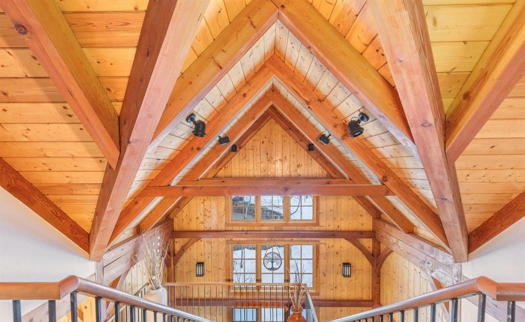 A striking double-height entryway featuring soaring cathedral timber framing with exposed wooden beams and white shiplap accents, flooded with natural light through multiple windows and skylights. The sophisticated interplay of warm natural wood tones, crisp white architectural details, and black metal railings creates a dramatic yet welcoming mountain-modern aesthetic that balances rustic warmth with contemporary elegance.