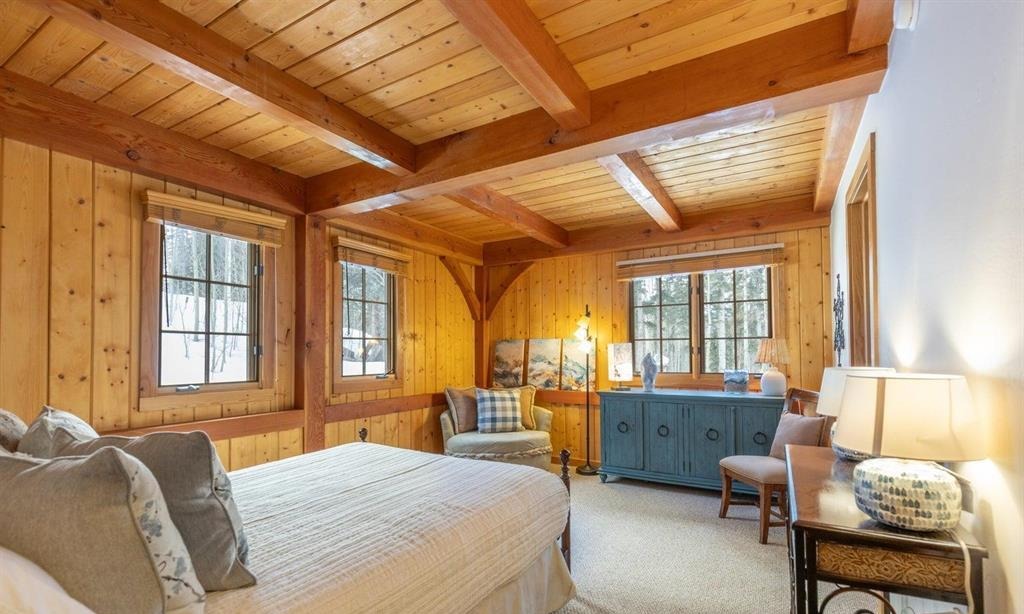 A stunning mountain modern primary bedroom featuring soaring exposed timber beams, extensive natural wood paneling, and abundant skylights that flood the space with warm light. The room artfully balances rustic architectural elements with contemporary furnishings, including a blue-gray painted dresser and neutral upholstered seating, creating a sophisticated yet serene retreat.