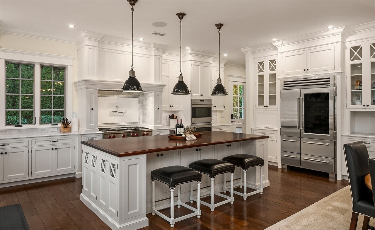 A stunning luxury kitchen featuring pristine white cabinetry with traditional paneled detailing, paired with a striking waterfall-edge marble island topped in rich dark walnut wood. Floor-to-ceiling windows flood the space with natural light, while black industrial pendant lights, custom crown molding, and high-end stainless steel appliances create a sophisticated, timeless design that seamlessly blends classic architecture with contemporary luxury.