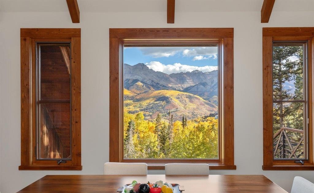 A stunning mountain-modern dining room featuring a substantial walnut wood table framed by floor-to-ceiling windows showcasing dramatic alpine vistas with golden aspens and snow-capped peaks. Exposed timber ceiling beams and white walls create a refined yet organic aesthetic that seamlessly integrates the spectacular natural landscape as the room's primary design element.