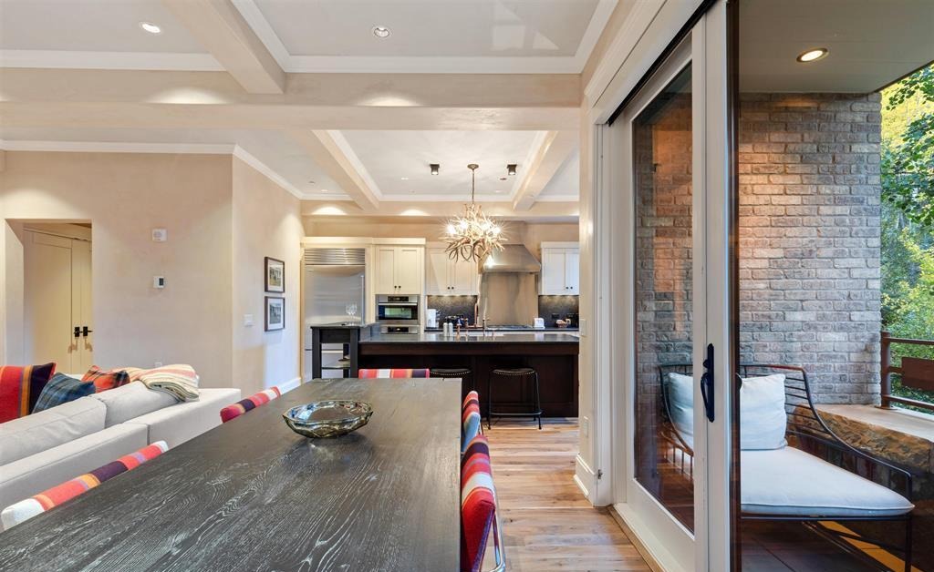 A sophisticated open-concept family room and kitchen featuring a striking two-tone design with a white perimeter kitchen and dramatic dark island, unified by elegant coffered ceilings and abundant natural light from floor-to-ceiling windows. The space balances modern clean lines with warm traditional architectural details, complemented by jewel-tone striped upholstery that adds visual energy and personality.