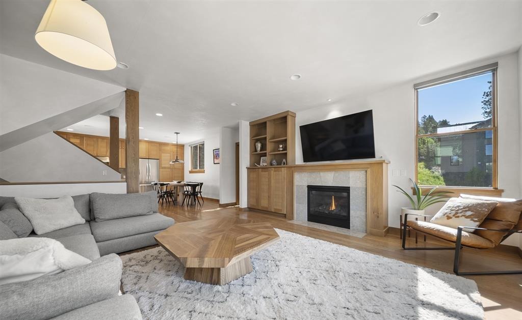 A sophisticated open-concept living space featuring a striking exposed wooden beam structural element, natural hardwood flooring, and a seamlessly integrated built-in entertainment wall with fireplace and custom cabinetry. The room balances organic natural materials with clean modern lines, enhanced by abundant natural light from floor-to-ceiling windows and a carefully curated palette of warm neutrals and quality furnishings.