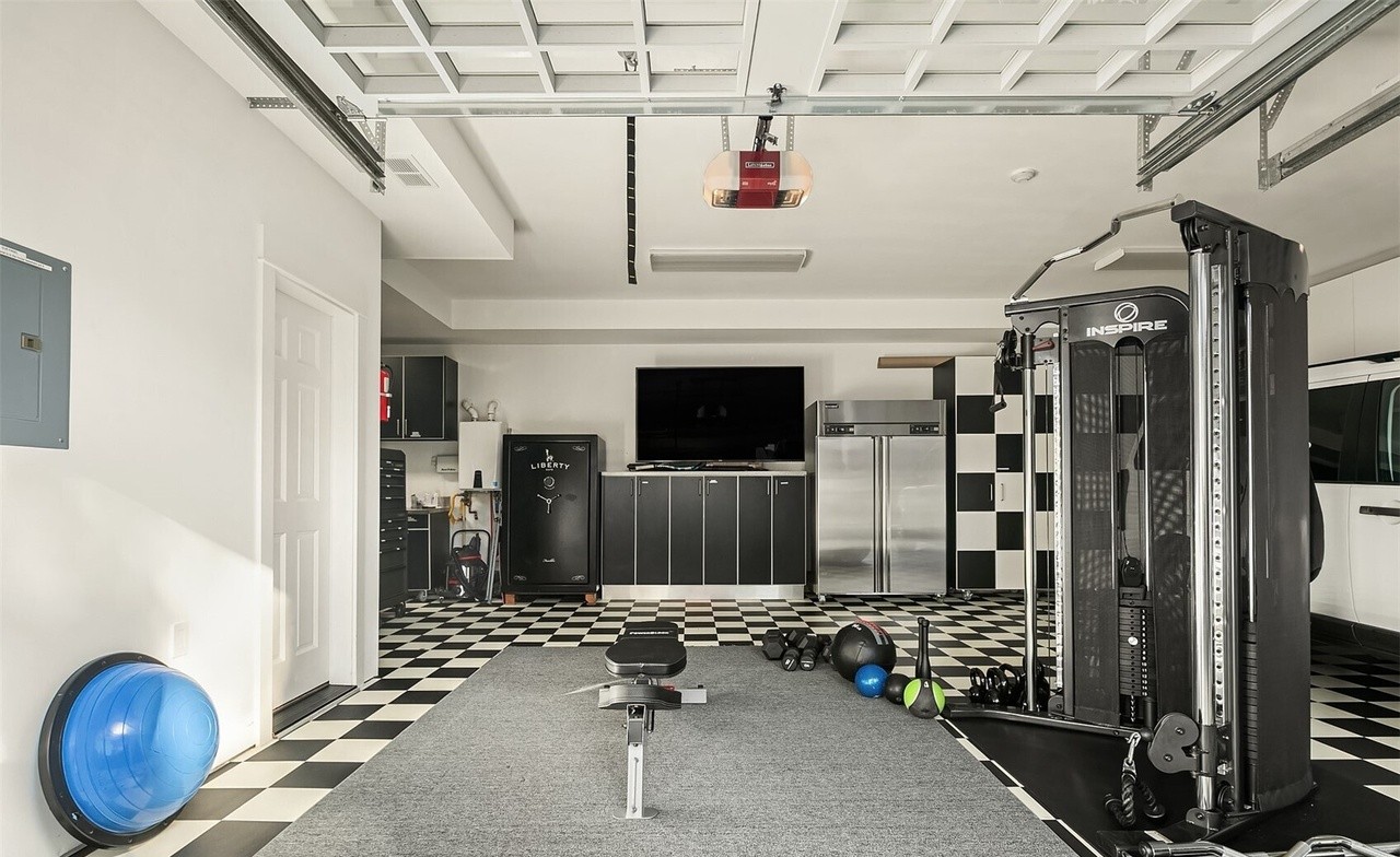 A premium home gym with dramatic black-and-white color blocking and coffered ceiling details, featuring professional-grade exercise equipment arranged on a large gray athletic floor mat. The sophisticated monochromatic palette and clean architectural lines create an energizing yet refined workout environment.