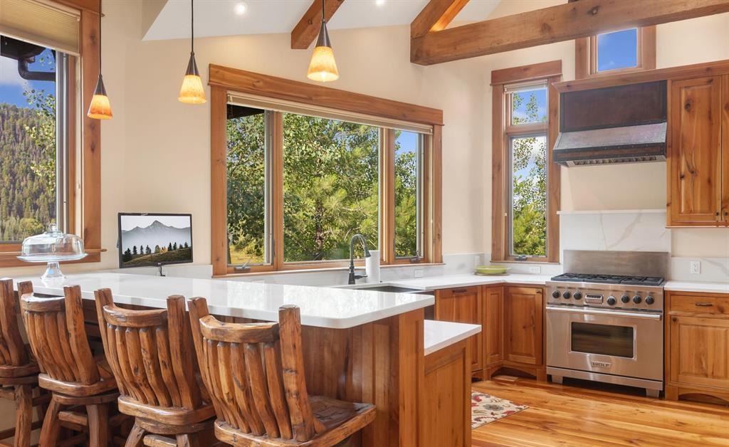 Countertop: QuartzCabinets: Natural WoodCabinet Color: Light WoodFlooring: HardwoodBacksplash: Stone SlabCeiling: Beamed