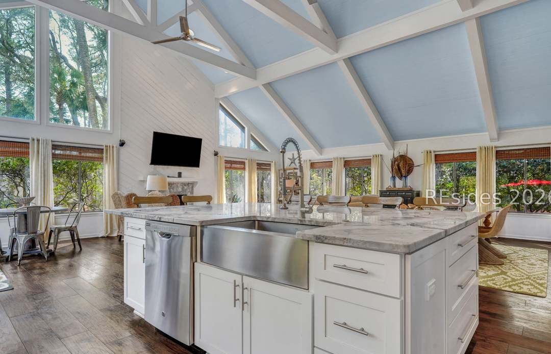 A stunning open-concept kitchen with vaulted cathedral ceilings and abundant natural light from expansive windows and skylights, featuring a striking waterfall-edge quartzite island with white shaker cabinetry and stainless steel appliances. The warm hardwood flooring and exposed ceiling beams balance the crisp white elements, creating a sophisticated yet inviting organic-modern aesthetic ideal for luxury coastal or transitional living.