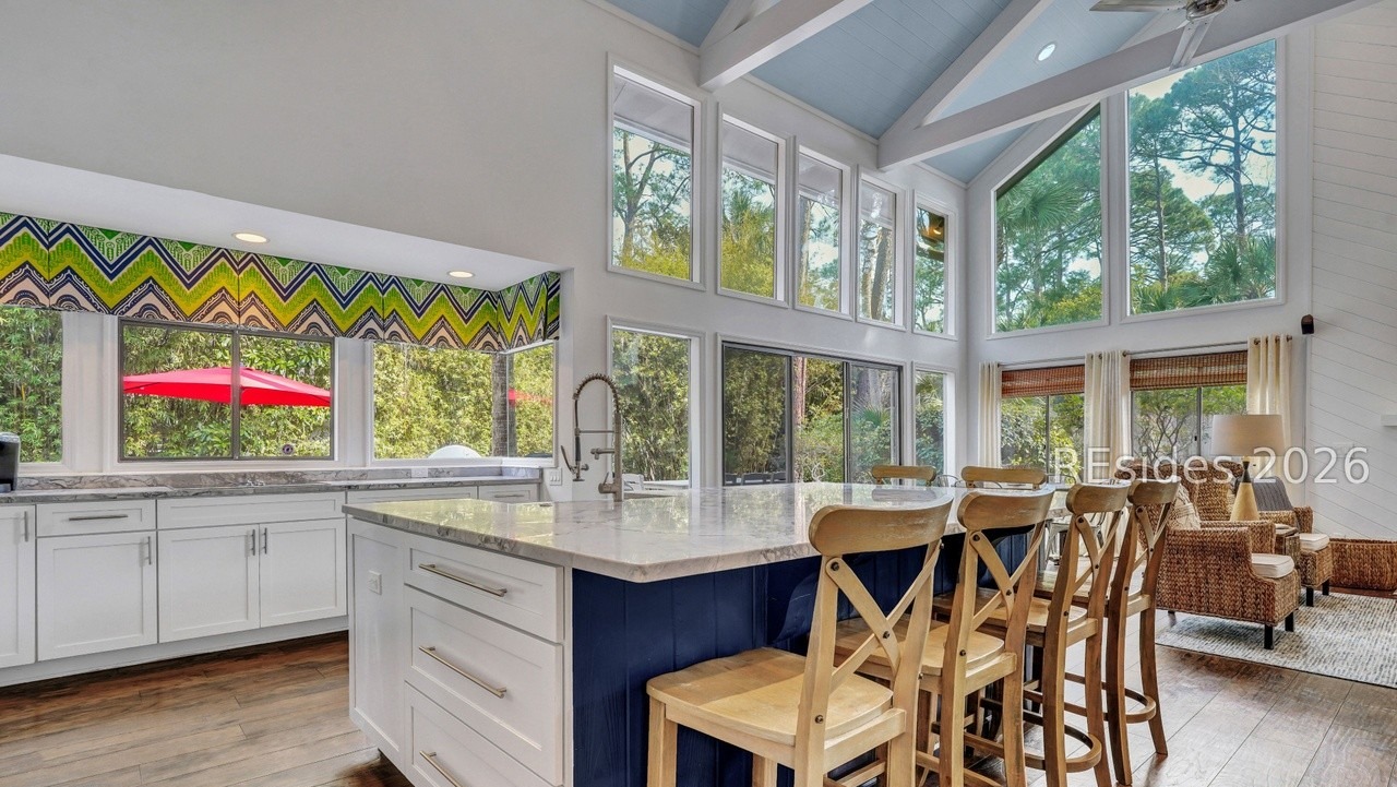 This stunning open-concept kitchen showcases a sophisticated transitional design with floor-to-ceiling windows flooding the space with natural light, complemented by a striking navy waterfall island with brass hardware and white shaker cabinetry. The coffered ceiling, crown molding, and carefully curated interior-to-exterior visual connection create a harmonious blend of refined elegance and organic warmth, elevated by premium quartz countertops and warm hardwood flooring.