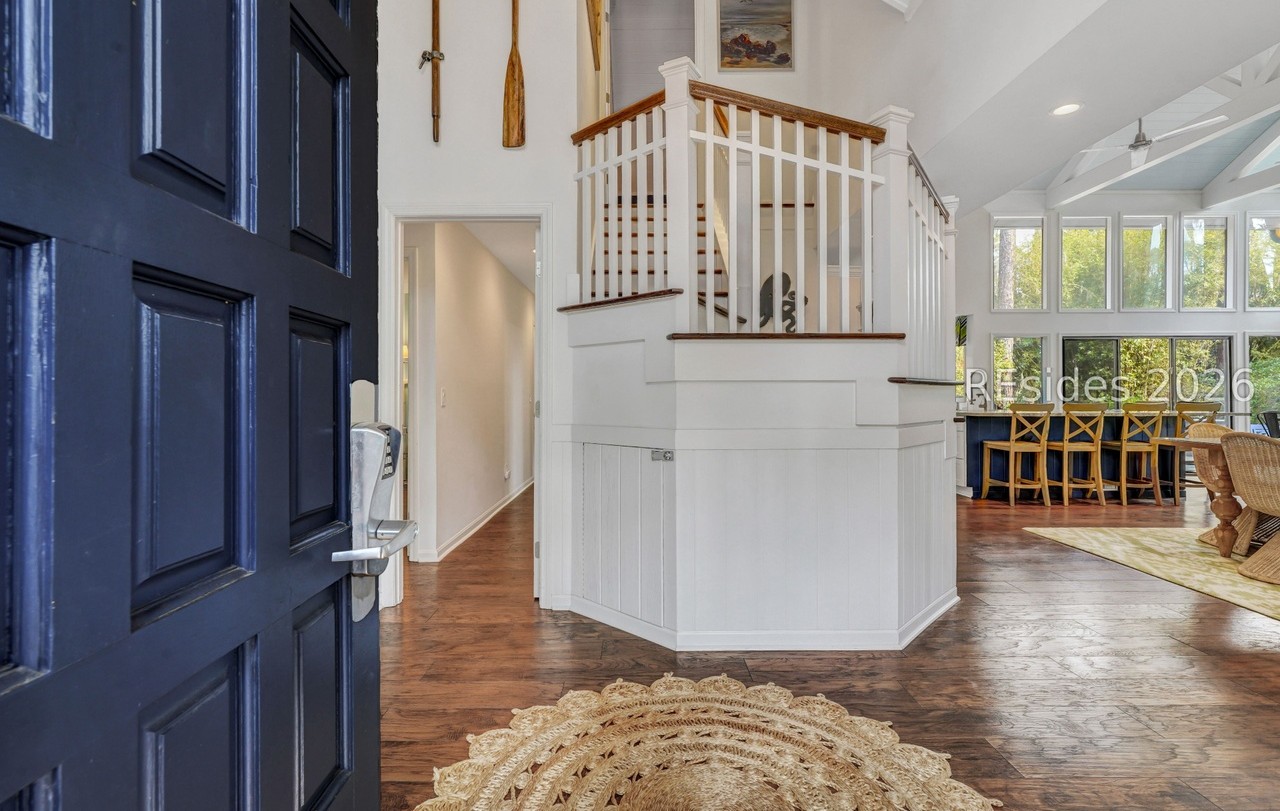 A sophisticated two-story entryway featuring a classic transitional design with white shaker-style wainscoting, a vaulted ceiling with recessed lighting, and hardwood flooring that flows into adjacent living spaces. The palette of crisp white, navy blue accents, and natural wood tones creates an elegant, airy atmosphere enhanced by abundant natural light from the expansive window walls, epitomizing New England-inspired coastal luxury.