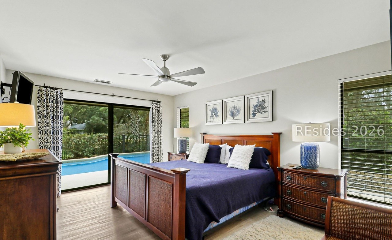 A sophisticated primary bedroom showcasing transitional coastal design with abundant natural light from floor-to-ceiling windows overlooking a luxury pool area. The space balances warm wood furnishings and brass accents with crisp white walls and navy bedding, creating an airy yet luxurious retreat with seamless indoor-outdoor integration.