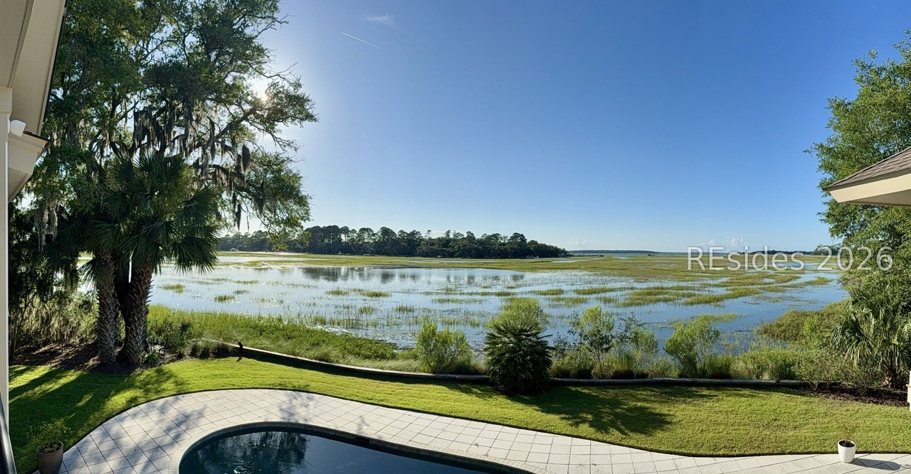An exceptional luxury waterfront pool area with a modern curved pool design overlooking pristine salt marshes and mature palm trees, exemplifying high-end coastal luxury residential architecture. The composition balances geometric hardscape elements with lush natural landscaping and expansive water views, creating a serene resort-quality outdoor living space.