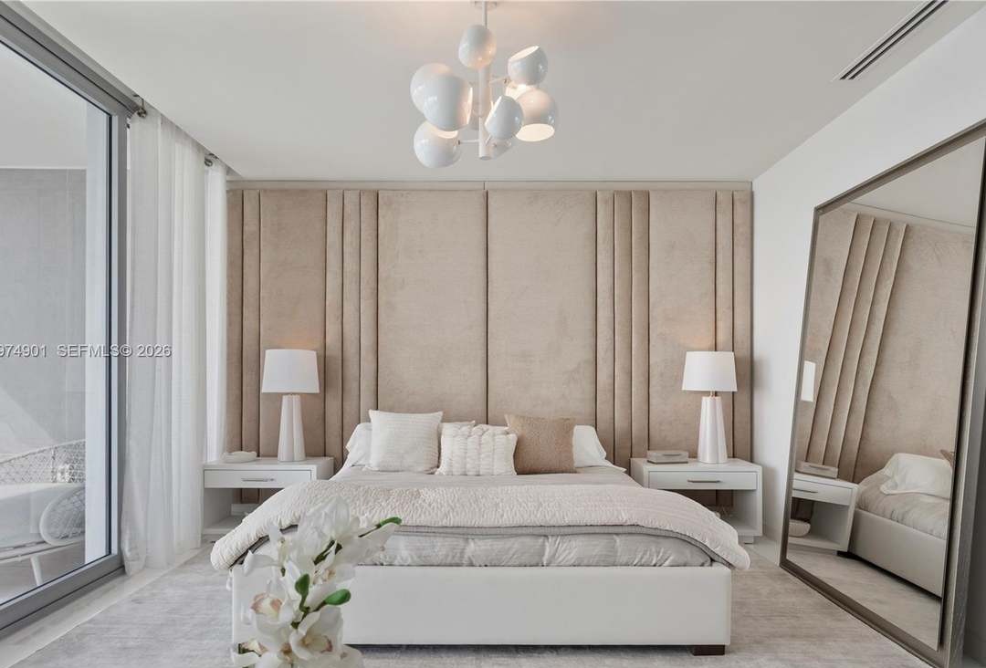 A serene primary bedroom featuring a monumental floor-to-ceiling upholstered wall panel in vertical channeling that serves as both headboard and architectural statement. The space exhibits sophisticated restraint with its neutral palette, sculptural modern chandelier, floating nightstands, and abundant natural light through expansive windows creating an elegant, spa-like retreat.