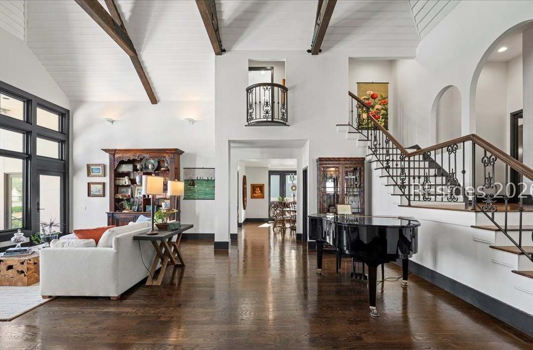 This soaring two-story foyer exemplifies transitional luxury with exposed timber beams, vaulted ceilings, and abundant natural light flooding through oversized windows and skylights. The space seamlessly blends traditional architectural elements—ornate wood cabinetry, wrought-iron stair railings, and warm hardwood floors—with clean modern furnishings and a white palette, creating a sophisticated, airy grand entrance that feels both formal and inviting.