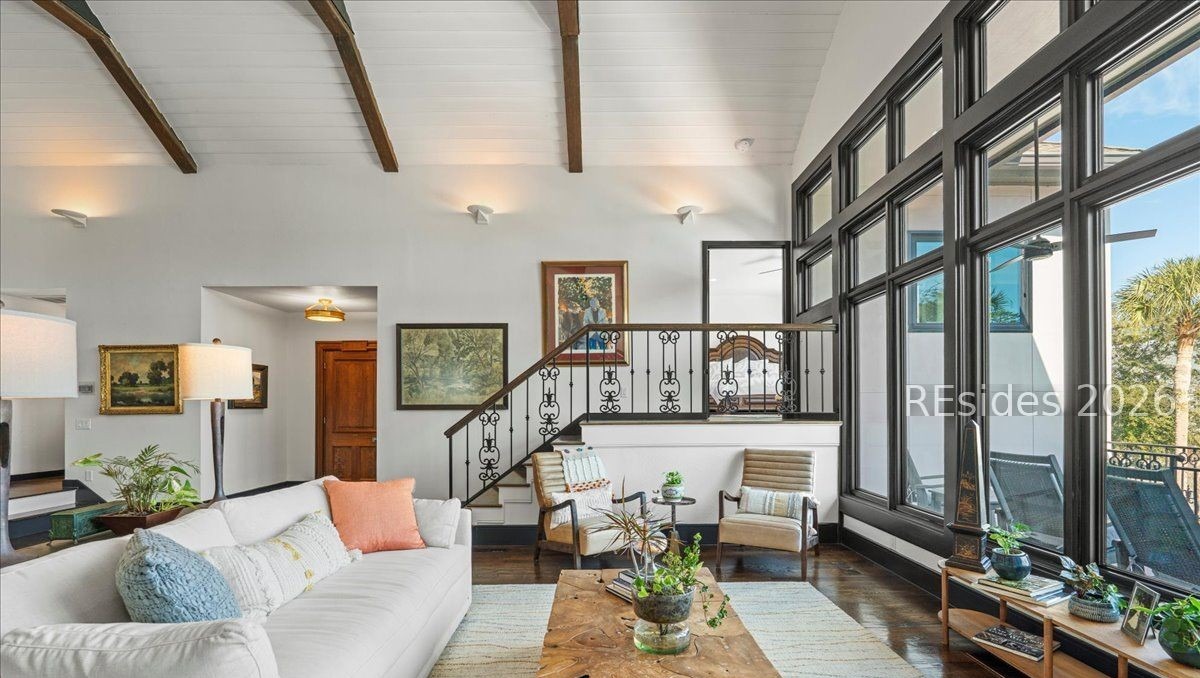 A stunning open-concept living room featuring soaring ceilings with exposed wooden beams and expansive floor-to-ceiling windows that flood the space with natural light. The design blends transitional elegance with organic modern warmth, combining a clean-lined cream linen sofa, natural wood furnishings, and layered textures with traditional architectural details like wrought-iron railings and classical artwork, creating a serene yet sophisticated sanctuary.