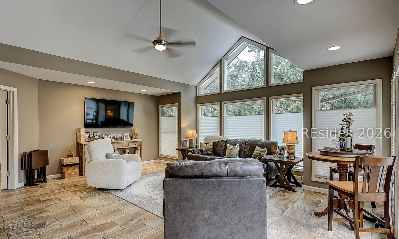 A sophisticated great room featuring a cathedral vaulted ceiling with abundant natural light from expansive skylights and transom windows, creating an airy and luminous space. The transitional design seamlessly blends traditional architectural elements (crown molding, coffered detailing) with modern furnishings in warm neutrals, complemented by warm wood tones, quality leather seating, and refined brass hardware throughout.