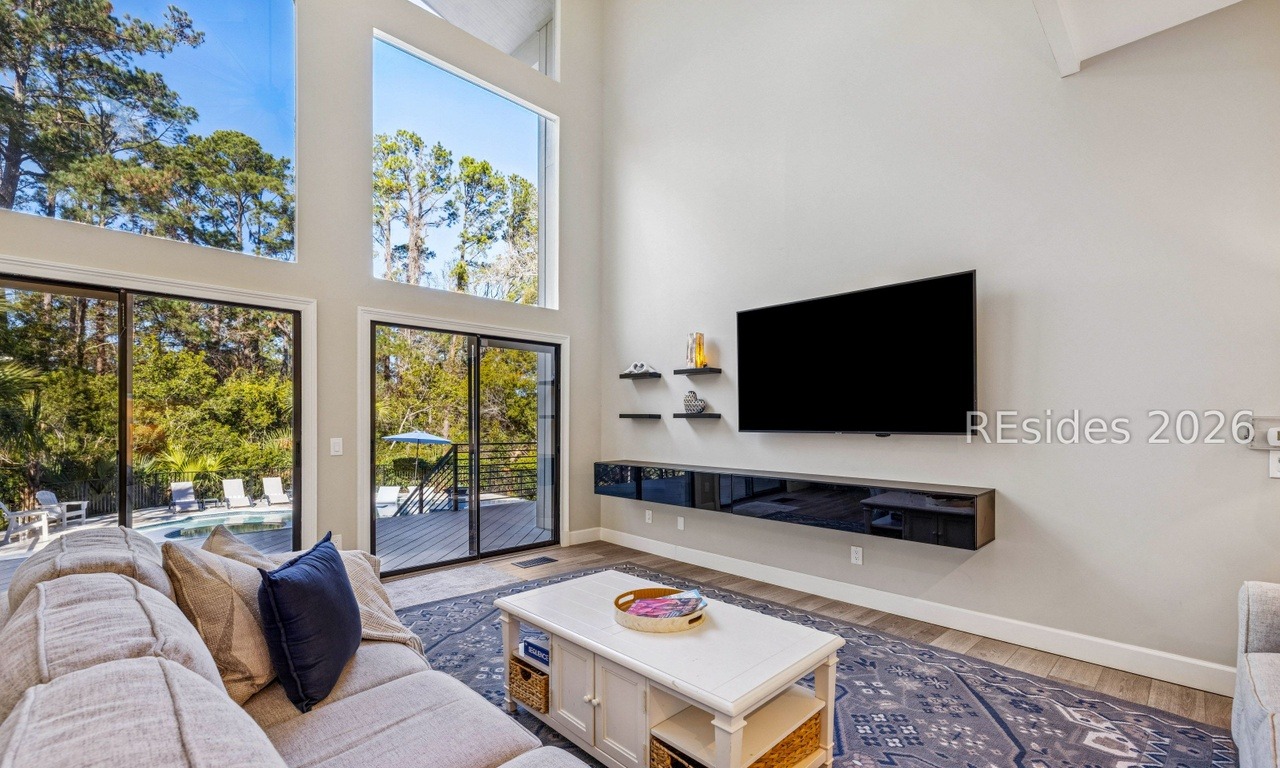 A sophisticated family room with soaring vaulted ceilings and abundant natural light from floor-to-ceiling glass doors opening onto a resort-style deck with pool and mature landscaping. The space features warm transitional design with a cream and navy palette, floating media console with black hardware, and carefully curated furnishings in natural textures that balance contemporary minimalism with comfort.