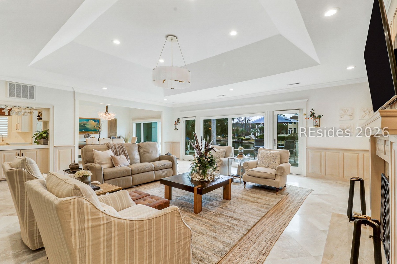 A sophisticated transitional living room bathed in natural light from expansive multi-panel glass doors, featuring a warm neutral palette of cream, beige, and soft gold upholstery anchored by a sculptural wooden coffee table and contemporary pendant lighting. The space seamlessly blends traditional architectural details—tray ceiling, crown molding, wainscoting—with clean-lined modern furnishings and organic materials, creating an airy yet refined retreat with coastal Hamptons sensibility.