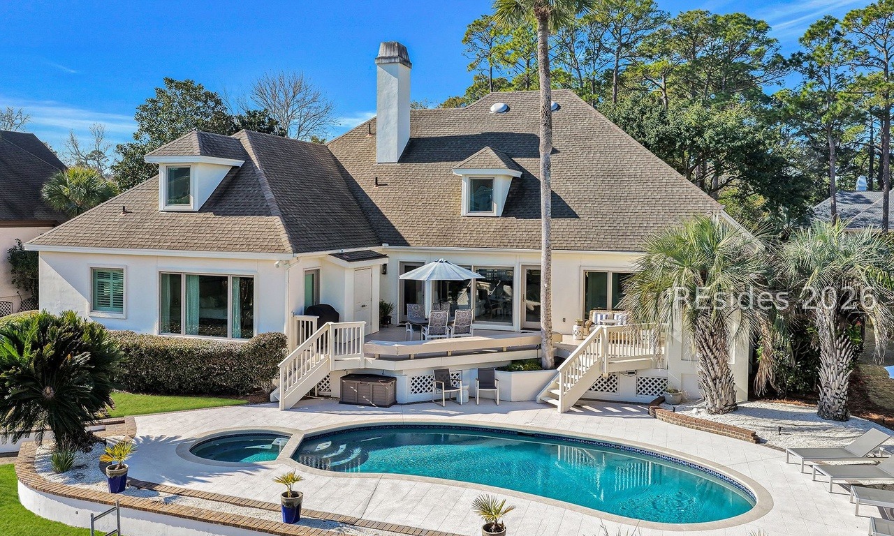 A stunning ultra-luxury coastal pool area featuring a resort-style turquoise saltwater pool with adjacent hot tub, anchored by a sophisticated white and cream painted house with multiple dormers and a tall chimney. The multi-tiered concrete deck, white railings, pergola-covered entertaining areas, and lush tropical landscaping create an elegant indoor-outdoor living environment characteristic of high-end coastal residential design.