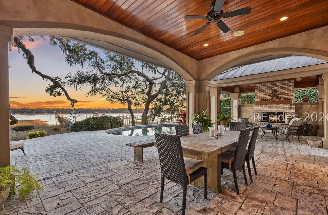 Covered PatioOutdoor Dining TableWater ViewMature Oak TreeSkylightCeiling FanRecessed LightingFireplaceBrick Interior WallHigh CeilingsArched Covered StructureLounge SeatingPool Visible