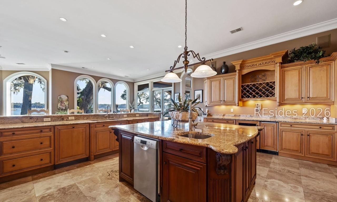 Waterfall IslandLarge IslandFloor To Ceiling WindowsAbundant Natural LightCustom MillworkCrown MoldingWine RackPendant LightingOpen ShelvingHigh CeilingsWater Views