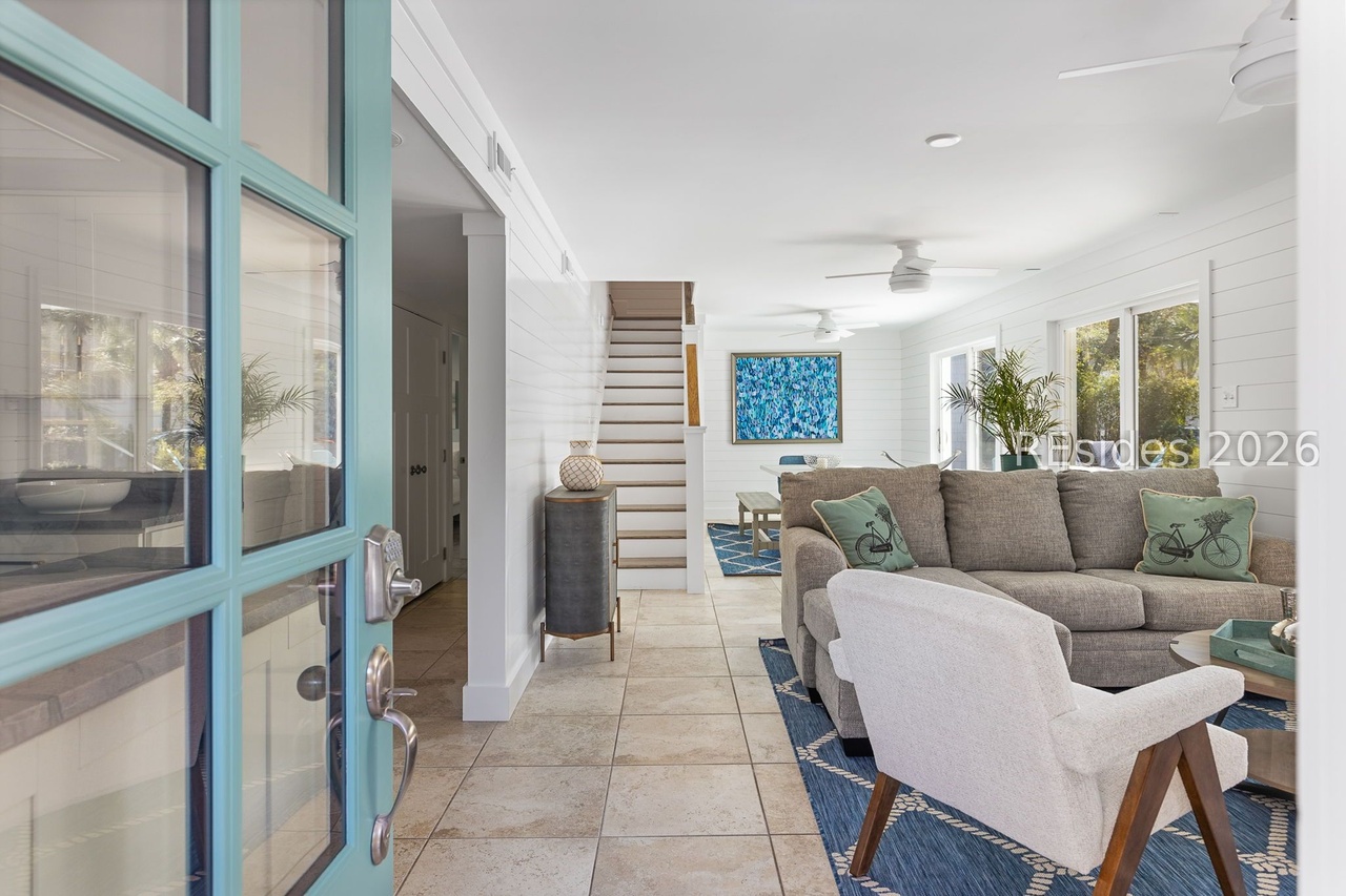 This bright, airy open-concept family room seamlessly blends coastal and transitional design with abundant natural light from floor-to-ceiling turquoise-framed windows. The sophisticated palette of whites, beige, and soft blues is anchored by a neutral linen sofa with sage green accents and complemented by polished hardwood and ceramic tile flooring, creating a serene yet elegant living space.
