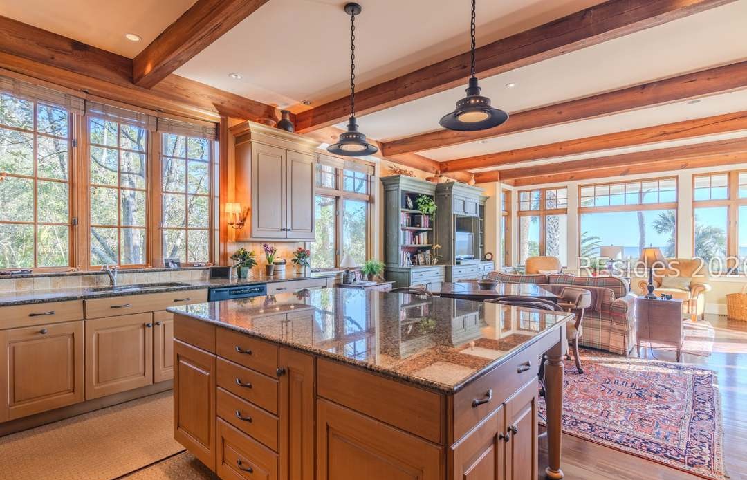 A luxuriously appointed kitchen featuring prominent exposed timber beams, warm natural wood cabinetry with a waterfall granite island, and expansive floor-to-ceiling windows flooding the space with natural light. The design masterfully blends transitional architecture with organic modern warmth, creating a sophisticated yet inviting great room atmosphere that flows seamlessly into adjoining living spaces.
