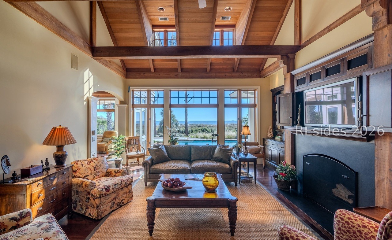A stunning great room featuring coffered wood ceilings with exposed timber beams, flowing open-concept design, and floor-to-ceiling windows framing a resort-quality pool and mountain views. The layered interior combines warm earth tones, heritage furnishings, and refined details like brass lighting and a striking black fireplace surround, creating an elegant yet comfortable retreat that seamlessly blends luxury with livability.