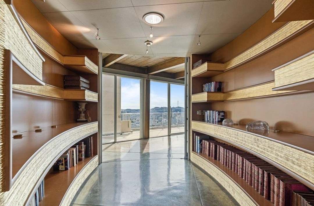 Built In ShelvingCustom MillworkCurved Shelving UnitsFloor To Ceiling WindowsCoffered CeilingRecessed LightingCurved ArchwaysPanoramic City Views