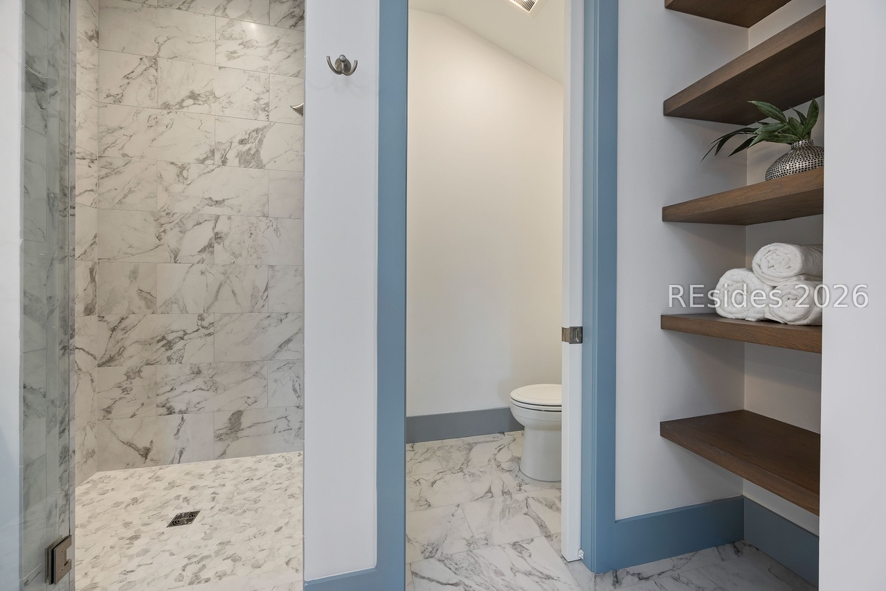 A sophisticated primary bathroom featuring large-format marble tile in the walk-in shower, complemented by walnut floating shelves with white marble flooring. The design balances cool blue-gray accent walls with warm wood shelving, creating a serene yet luxurious spa-like retreat with clean contemporary lines and refined details.