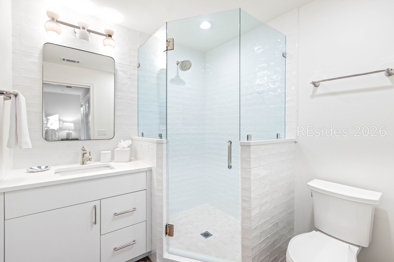 A beautifully appointed primary bathroom featuring a spa-like walk-in shower with frameless glass enclosure and rainfall showerhead, paired with a crisp white floating vanity and large statement mirror. The clean white subway tile palette, premium quartz countertop, and soft contemporary fixtures create a serene, sophisticated retreat with an emphasis on light and minimalist elegance.